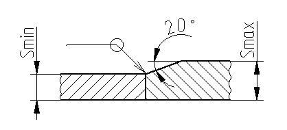 Продольные швы смежных обечаек допускается не смещать при pраб ≤ 1,6 МПа и t ≤ 400 °С, с номинальной толщиной стенки не более 30 мм при условии, что эти швы выполнены автоматической или электрошлаковой сваркой и места пересечения швов контролируют методом радиографии или ультразвуковой дефектоскопии в объеме 100 %. При приварке опор расстояние от края сварного шва сосуда и края опоры должно быть не менее толщины стенки корпуса, но не менее 20 мм. При сварке элементов разной толщины должен быть обеспечен плавный переход с углом не менее 20° (см. рисунок). Допускается не делать утонение, если Smax - Smin < 5